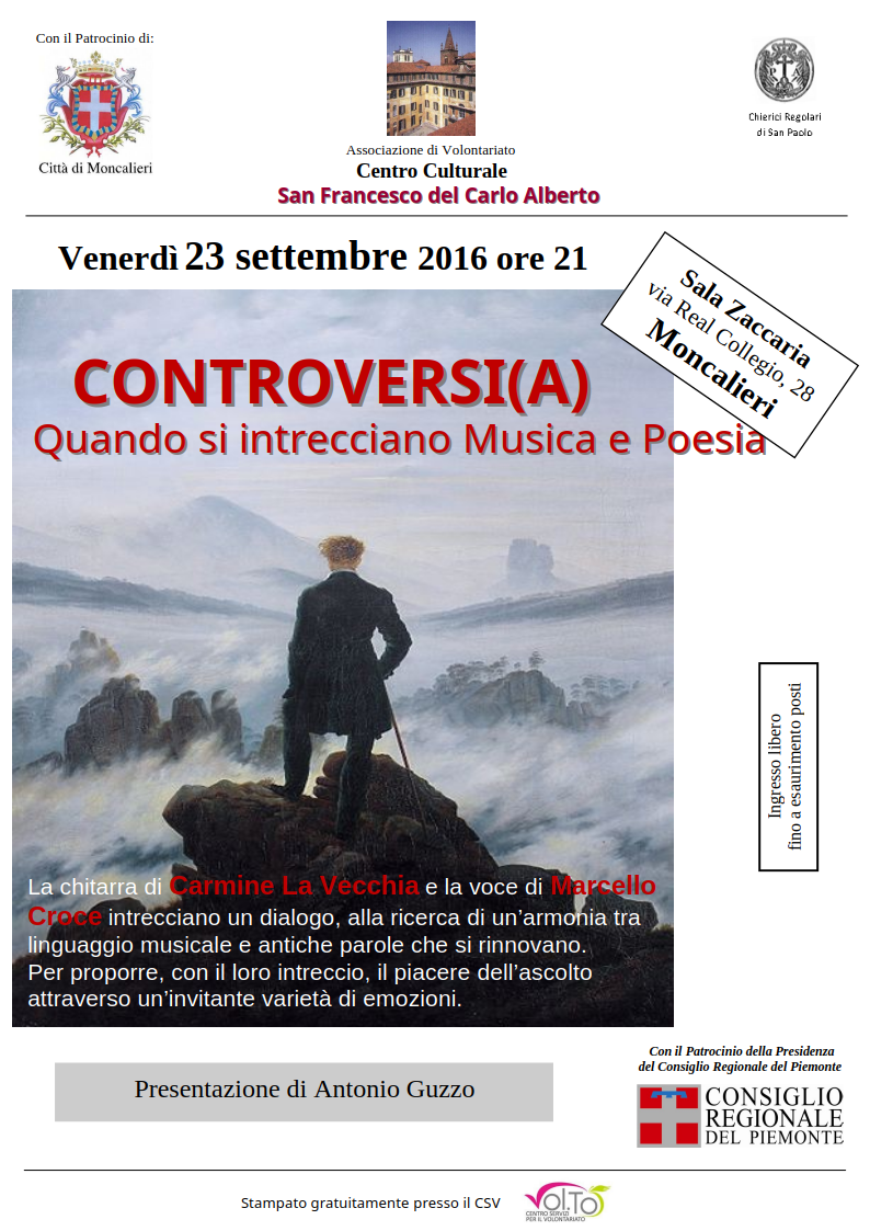 Carmine La Vecchia e Marcello Croce Scarica locandina Quando 23 Settembre 2016 Dove Sala Zaccaria Real Collegio Moncalieri Ora 21,00 Intervengono La chitarra di Carmine La Vecchia e la voce di Marcello Croce intrecciano un dialogo, alla ricerca di un’armonia tra linguaggio musicale e antiche parole che si rinnovano. Per proporre, con il loro intreccio, […]