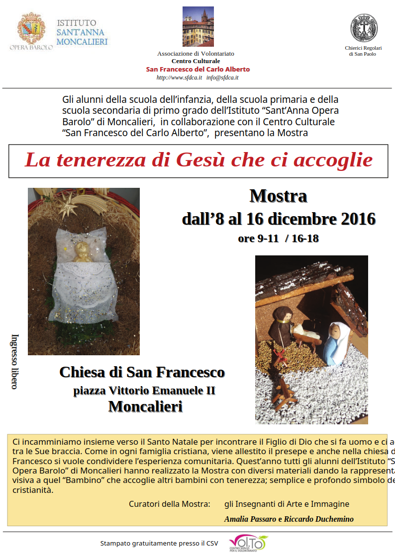 | Note | Ci incamminiamo insieme verso il Santo Natale per incontrare il Figlio di Dio che si fa uomo e ci accoglie tra le Sue braccia. Quest’anno tutti gli alunni dell’Istituto “Sant’Anna Opera Barolo” di Moncalieri hanno realizzato la Mostra con diversi materiali dando la rappresentazione visiva a quel “Bambino” che accoglie altri bambini con tenerezza; semplice e profondo simbolo della cristianità. |